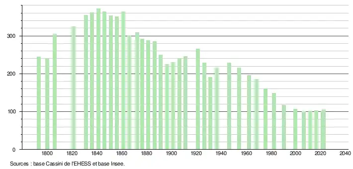 L'évolution du nombre d'habitants est connue à travers les recensements de la population effectués dans la commune depuis 1793. Pour les communes de moins de 10 000 habitants, une enquête de recensement portant sur toute la population est réalisée tous les cinq ans, les populations de référence des années intermédiaires étant quant à elles estimées par interpolation ou extrapolation[17]. Pour la commune, le premier recensement exhaustif entrant dans le cadre du nouveau dispositif a été réalisé en 2006[18].