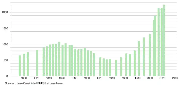 L'évolution du nombre d'habitants est connue à travers les recensements de la population effectués dans la commune depuis 1793. Pour les communes de moins de 10 000 habitants, une enquête de recensement portant sur toute la population est réalisée tous les cinq ans, les populations de référence des années intermédiaires étant quant à elles estimées par interpolation ou extrapolation[29]. Pour la commune, le premier recensement exhaustif entrant dans le cadre du nouveau dispositif a été réalisé en 2008[30].