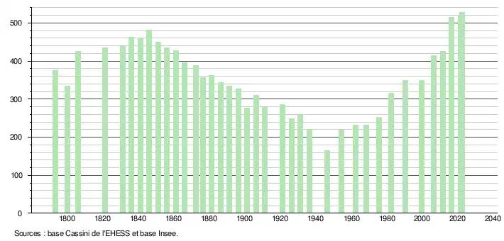 L'évolution du nombre d'habitants est connue à travers les recensements de la population effectués dans la commune depuis 1793. Pour les communes de moins de 10 000 habitants, une enquête de recensement portant sur toute la population est réalisée tous les cinq ans, les populations de référence des années intermédiaires étant quant à elles estimées par interpolation ou extrapolation[26]. Pour la commune, le premier recensement exhaustif entrant dans le cadre du nouveau dispositif a été réalisé en 2006[27].