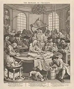 Cette scène de dissection en public se situe dans le Clutherian Theatre, près de la prison de Newgate. C'est un amphithéâtre qui servait aux étudiants du Collège des chirurgiens de Londres entre 1745 et 1751[13]. Sur la table de dissection, se trouve étendu le corps de Nero, qui a été pendu — la corde est encore visible autour de son cou. Les personnes présentes suivent la scène ou discutent sans manifester d'émotion. Le chirurgien en chef est assis au centre, sur une chaise à haut dossier, juste en dessous des armoiries royales. Sur le dossier de ce siège, on peut voir le blason des chirurgiens du Collège, une main prenant le pouls sur une autre main[13]. Le chirurgien en chef exprime un grand mépris pour le corps de Nero en le pointant à l'aide d'une baguette. Autour du cadavre, s'activent quatre assistants : l'un tente d'extraire un œil du crâne dans lequel est planté une vis afin de le surélever, un autre lui a ouvert le ventre, un troisième va inciser les mollets, et le dernier en extrait les intestins qu'il accumule dans un seau. Pendant ce temps-là, un chien, au premier plan, s'apprête à dévorer le cœur.