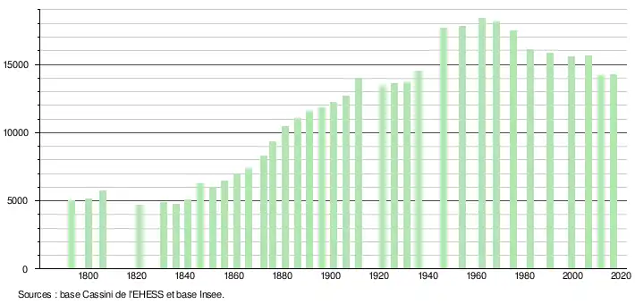 - ↑ Par convention dans Wikipédia, le principe a été retenu de n’afficher dans le tableau des recensements et le graphique, pour les populations de référence postérieures à 1999, que les populations correspondant à une enquête exhaustive de recensement pour les communes de moins de 10 000 habitants, et que les populations des années 2006, 2011, 2016, etc. pour les communes de plus de 10 000 habitants, ainsi que la dernière population de référence publiée par l’Insee pour l'ensemble des communes.