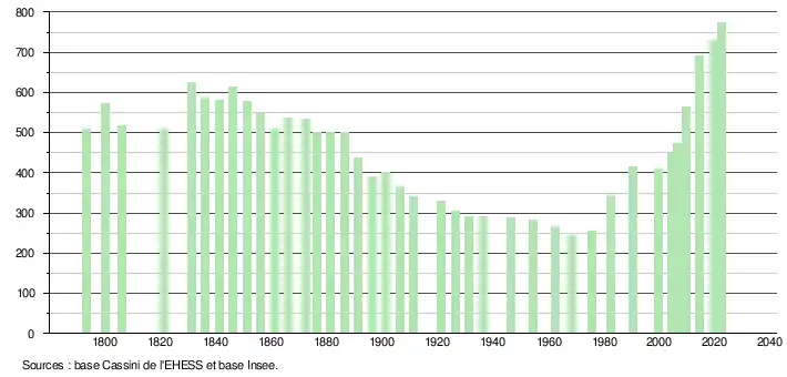 | L'évolution du nombre d'habitants est connue à travers les recensements de la population effectués dans la commune depuis 1793. Pour les communes de moins de 10 000 habitants, une enquête de recensement portant sur toute la population est réalisée tous les cinq ans, les populations de référence des années intermédiaires étant quant à elles estimées par interpolation ou extrapolation[30]. Pour la commune, le premier recensement exhaustif entrant dans le cadre du nouveau dispositif a été réalisé en 2004[31]. En 2022, la commune comptait 774 habitants[Note 5], en évolution de +10,41 % par rapport à 2016 (Tarn : +2,52 %, France hors Mayotte : +2,11 %).En 2019, la commune compte 726 habitants[28]. |