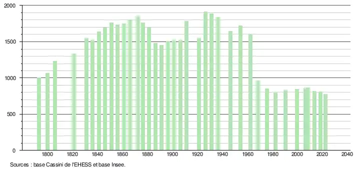 L'évolution du nombre d'habitants est connue à travers les recensements de la population effectués dans la commune depuis 1793. Pour les communes de moins de 10 000 habitants, une enquête de recensement portant sur toute la population est réalisée tous les cinq ans, les populations de référence des années intermédiaires étant quant à elles estimées par interpolation ou extrapolation[30]. Pour la commune, le premier recensement exhaustif entrant dans le cadre du nouveau dispositif a été réalisé en 2008[31].