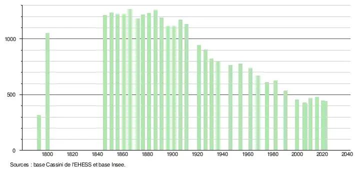 L'évolution du nombre d'habitants est connue à travers les recensements de la population effectués dans la commune depuis 1793. Pour les communes de moins de 10 000 habitants, une enquête de recensement portant sur toute la population est réalisée tous les cinq ans, les populations de référence des années intermédiaires étant quant à elles estimées par interpolation ou extrapolation[49]. Pour la commune, le premier recensement exhaustif entrant dans le cadre du nouveau dispositif a été réalisé en 2005[50].