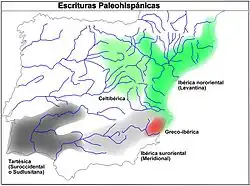 Elle est présente en Catalogne et sur le littoral méditerranéen jusque dans le Midi gaulois[2]. L'oppidum d'Ensérune, par exemple, présente une épigraphie paléohispanique importante et variée[2]. À Ensérune, 41,5 % des inscriptions levantines sont des marques de propriété. On les trouve sur des céramiques campaniennes et attiques, sur la céramique de la côte catalane et sur les amphores. Environ 32 % de ces inscriptions sont des noms celtiques par rapport à environ 25 % de noms ibères et 5 % de noms latins, et on ne sait pas vraiment pourquoi l'écriture paléohispanique est utilisée à Ensérune de préférence aux alphabets grec ou étrusque qui auraient plus facilement permis de transcrire les noms celtes[2].