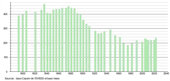 L'évolution du nombre d'habitants est connue à travers les recensements de la population effectués dans la commune depuis 1793. Pour les communes de moins de 10 000 habitants, une enquête de recensement portant sur toute la population est réalisée tous les cinq ans, les populations de référence des années intermédiaires étant quant à elles estimées par interpolation ou extrapolation[22]. Pour la commune, le premier recensement exhaustif entrant dans le cadre du nouveau dispositif a été réalisé en 2004[23].