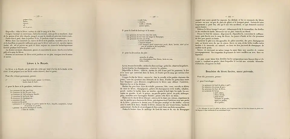 - ↑ Aristide Couteaux, « La recette du lièvre à la royale », Le Temps, no 13691, , p. 2 (lire en ligne).