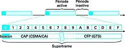 IEEE 802.15.4[31] est donc une norme radio sans fil à bas débit et à courte portée de type LP-WPAN[note 8]. Elle se caractérise par une portée comprise entre quelques mètres et quelques centaines de mètres et un débit inférieur à 250 kbit/s. Elle est optimisée pour une très faible utilisation du médium, par exemple 0,1% du temps[32]. Le reste du temps, le module ZigBee se met en veille pour économiser son énergie. Pendant cette veille, il ne peut ni émettre, ni recevoir de données. Conçu pour interconnecter des petits équipements autonomes tels que des capteurs qui se réveillent périodiquement ou sur événement local, un émetteur-récepteur ZigBee alimenté par des piles classiques peut avoir une autonomie de quelques semaines à quelques mois voire quelques années, en fonction du profil de trafic généré sur l'onde radio.