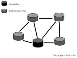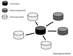 Deux différents types d'équipements sont définis par IEEE 802.15.4: les entités complètes FFD[note 12], c'est-à-dire possédant toutes les fonctions, et les équipements avec fonctions limitées RFD[note 13], un FFD[note 13] peut parler à un autre FFD[note 12] ou RFD[note 13] mais un RFD[note 12] ne peut communiquer que via un FFD[30].