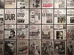 « A la derecha, los titulares del periódico Libération informan que se ha descubierto una tumba clandestina (charnier) con víctimas del régimen dictatorial del rumano Ceaucescu y también se puede leer una noticia sobre una multinacional francesa, «Brasil: La limosna de Elf Acquitaine a los Indios de la Amazonia". »