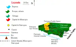 Son chef-lieu est la localité de Mene Grande et ses villes principales les localités de La Tigra, San Pedro, Zamora, La Curva de San Juan, San Juan, Santa Rosa et Las Granjas.