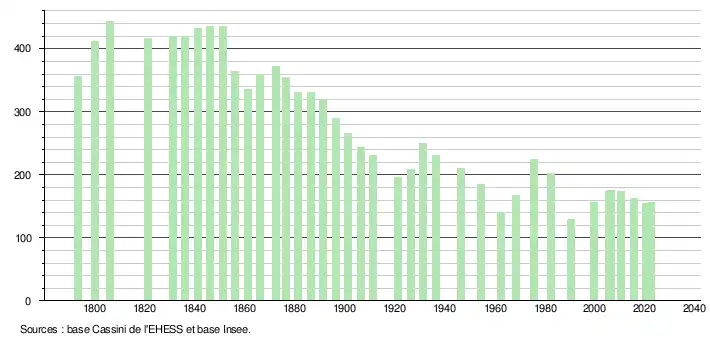 L'évolution du nombre d'habitants est connue à travers les recensements de la population effectués dans la commune depuis 1793. Pour les communes de moins de 10 000 habitants, une enquête de recensement portant sur toute la population est réalisée tous les cinq ans, les populations de référence des années intermédiaires étant quant à elles estimées par interpolation ou extrapolation[13]. Pour la commune, le premier recensement exhaustif entrant dans le cadre du nouveau dispositif a été réalisé en 2005[14].