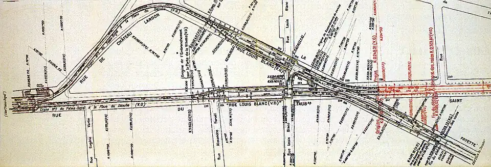 Danube est à l'inverse desservie dans la direction Louis Blanc ; elle comporte également deux voies, la section depuis Pré-Saint-Gervais jusqu'à l'entrée est de la station Botzaris étant à deux voies dont l'une sert de garage et plus récemment d'atelier d'entretien courant des rames de la ligne.