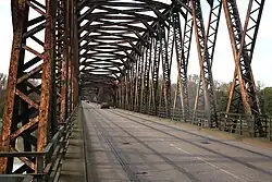 Le pont sur le Rhin est devenu un pont routier. Les anciens rails subsistent dans la chaussée.