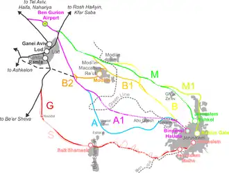 - Les Plans B, B1, B2, M et M1 proposent la construction d'une nouvelle ligne passant par Modiin-Maccabim-Reout, plus au nord.
