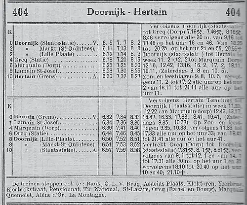 - 404B en , numéro et tableau partagés avec la ligne H (404A) Tournai Station-État - Hertain Frontière [5].