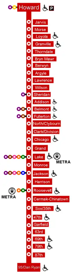 La ligne rouge du métro de Chicago est la plus fréquentée du réseau, elle transporte chaque jour 230 000 passagers. Son parcours long de 33 stations et de 37,7 km roule de la limite nord de la ville de Chicago dans le quartier de Rogers Park (Howard) jusqu'à celui de Roseland (95th/Dan Ryan) dans le sud de la ville. À l'instar de la ligne bleue, la ligne rouge fonctionne 24 heures/24 et 7 jours/7.