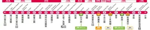 | R5 | Cianjhen Senior High School | 前鎮高中 | Cianjhen | Correspondance avec la ligne jaune |