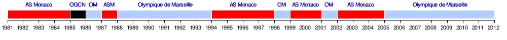 - ↑ L'OM a également terminé en tête du championnat de France en 1993 mais s'est vu retirer son titre à la suite de l'affaire VA-OM.