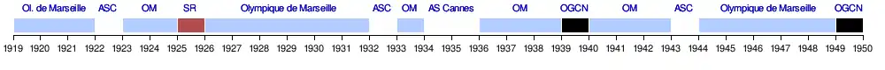 - ↑ L'équipe réserve de l'Olympique de Marseille a remporté trois des sept titres du club.
