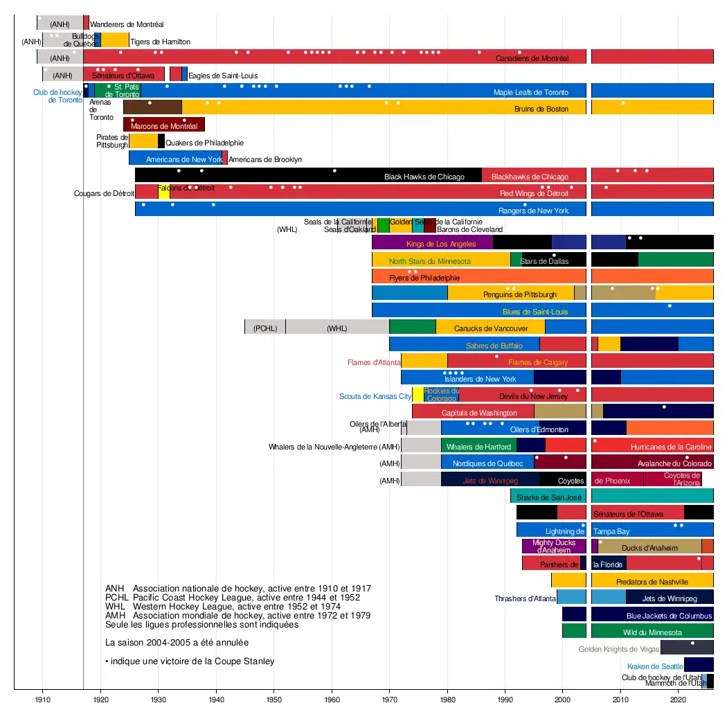 | Plus titré(s) | Canadiens de Montréal (25 dont 24 Coupes Stanley)[Note 1] |