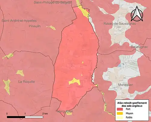 Le retrait-gonflement des sols argileux est susceptible d'engendrer des dommages importants aux bâtiments en cas d’alternance de périodes de sécheresse et de pluie. La totalité de la commune est en aléa moyen ou fort (67,4 % au niveau départemental et 48,5 % au niveau national). Sur les 85 bâtiments dénombrés sur la commune en 2019, 85 sont en aléa moyen ou fort, soit 100 %, à comparer aux 84 % au niveau départemental et 54 % au niveau national. Une cartographie de l'exposition du territoire national au retrait gonflement des sols argileux est disponible sur le site du BRGM[17],[Carte 2].