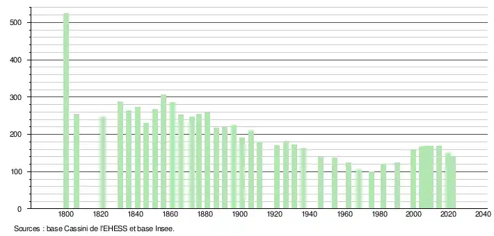 L'évolution du nombre d'habitants est connue à travers les recensements de la population effectués dans la commune depuis 1800. Pour les communes de moins de 10 000 habitants, une enquête de recensement portant sur toute la population est réalisée tous les cinq ans, les populations de référence des années intermédiaires étant quant à elles estimées par interpolation ou extrapolation[19]. Pour la commune, le premier recensement exhaustif entrant dans le cadre du nouveau dispositif a été réalisé en 2004[20].