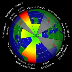 Les limites planétaires sont des seuils à l'échelle mondiale à ne pas dépasser pour que l’humanité puisse vivre dans un écosystème sûr, c’est-à-dire évitant les modifications brutales, non-linéaires, potentiellement catastrophiques et difficilement prévisibles de l’environnement. Le concept de limites planétaires est défini en 2009 par une équipe internationale de 26 chercheurs, menés par Johan Rockström du Stockholm Resilience Centre (en) et Will Steffen de l'université nationale australienne, dans un article publié dans les revues Nature[3] et Ecology and Society (en)[4]. Parmi ces chercheurs figurent notamment le climatologue James E. Hansen (directeur du Goddard Institute for Space Studies de la NASA, pionnier des recherches sur le changement climatique), Paul Crutzen (prix Nobel de chimie 1995), le climatologue allemand Hans Joachim Schellnhuber (fondateur du Potsdam-Institut für Klimafolgenforschung et conseiller du gouvernement allemand et de la Commission européenne sur le réchauffement climatique) et le géographe belge Éric Lambin.
