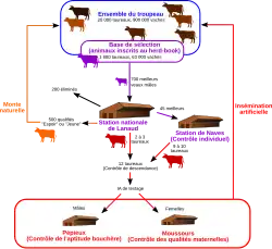 - ↑ Une station de sélection correspond à un bâtiment d'élevage où l'on regroupe des animaux afin de comparer leurs performances dans des conditions d'élevage et une alimentation identiques.