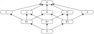 Exemple de graphe de dépendance avec les classes Z, K1, K2, K3, A, B, C, D, E, O.