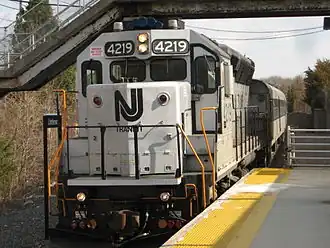 Un train de voyageurs de New Jersey Transit entre en gare de Lindenwold (en) en mars 2008.