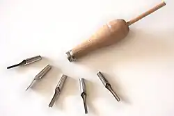 Les outils utilisés en gravure sur bois conviennent parfaitement à la linogravure : les gouges sont les outils de base. Elles sont souvent vendues par lots comportant un manche et des têtes interchangeables de différentes tailles et formes (en V ou en U[7]). Dans le cadre d'une maîtrise plus poussée, il est possible d'avoir recours à des outils plus précis : le matoir, une tige d'acier à tête lignée ou pointillée, permet en frappant d'obtenir des grisés. Des pointes ou un tube frappé au marteau permettent la création de points ronds. L'utilisation du « vélo » (ou échoppe rayée[8]) donne cependant des résultats moins probants qu'en gravure sur bois. Il est aussi possible d'avoir recours à des instruments plus fins, comme des canifs ou des ciseaux.