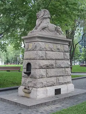 Le Lion de Belfort représente le lion emblématique britannique couché, orienté à l'est vers la France et le Royaume-Uni. Il est l'œuvre de George William Hill[2]. Comme indiqué sur la base du monument, Hill a été inspiré par le Lion de Belfort, une statue monumentale de Frédéric Bartholdi à Belfort, en France, reproduit à une échelle d'environ un dixième. La base en granit de la statue a été conçue par l'architecte montréalais d'origine écossaise Robert Findlay. Inauguré le 24 mai 1897, Le Lion est placé du côté est, le long de la rue Metcalfe. Il faisait initialement partie d' une fontaine prévue pour le jubilé de diamant de la reine Victoria par la Sun Life, compagnie d' assurance-vie avant l'aménagement de l'édifice Sun Life.