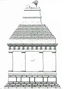 Le monument est carré avec un sommet pyramidal à gradins, le corps du lion creusé à partir d'un cercle. Cette similitude a conduit une partie des experts à dater l'œuvre de 350 av. J.-C., mais d'autres pensent que la statue surmontait un cénotaphe commémorant la bataille navale de Cnide voisine, en 394 av. J.-C., dans laquelle le général athénien Conon, commandant une flotte conjointe athénienne et perse, fut victorieux sur une flotte spartiate dirigée par Pisandre[2].