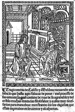 Du côté du théâtre, c’est La Comédie de Calixte et Melibée de Fernando de Rojas, également connue sous le nom La Célestine (publiée en 1499). Cette œuvre clé de la littérature espagnole relate l’histoire de deux amants, Calixte et Mélibée, qui ont recours aux services d’une prostituée du nom de Célestine pour favoriser leur amour.