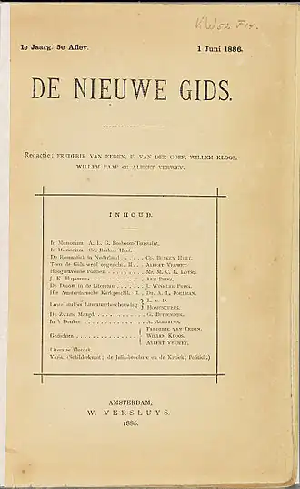 Malgré leurs différences de caractère et de dispositions, rien n'empêche des jeunes gens, initialement unis dans le rejet de la littérature des générations précédentes, de collaborer à une même revue. Kloos est le véritable chef du mouvement. Mais bientôt, des différends surgissent entre les rédacteurs : en 1887, entre Van Eeden et d'autres (après leur jugement porté sur Een liefde, ou Un amour, de Van Deysel) ; en 1890, entre Willem Kloos et un Albert Verwey (1865-1937) de plus en plus indépendant ; et, enfin, en 1894, la crise autour de Kloos, qui est d'une telle ampleur que l'on peut parler de la fin du Nieuwe Gids, bien que la revue ait continué à exister sous la forme d'un mensuel, à côté du Tweemaandelijksch Tijdschrift, une nouvelle revue bimensuelle, fondée par Verwey et Van Deyssel.