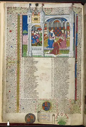 D'autres textes de chansons de geste et de chevalerie sont également présents : Ogier de Danemarche (f.86-154v), Regnaut de Montauban et les Quatre fils Aymon (f.155-206), Pontus et Sidoine (f.207-226v), Guy de Warwick (f.227-265) et Heraud d'Ardenne (f.266v-272), la Chanson du Chevalier au Cygne (f.273-292), L'arbre de batailles (f.293-325v), le Livres du gouvernement des rois (f.327-361), Chroniques de Normandie (f.363-401), Breviaire des nobles d'Alain Chartier (f.403-404v), Les fais d'armes et de chevalerie de Christine de Pisan (f.405-438). Il s'achève sur les statuts de l'Ordre de la Jarretière (f.439-440v)[1].