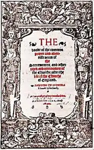 Le Livre de prières communes de 1549 est un compromis temporaire entre le point de vue des réformateurs et celui des conservateurs[41] ; il conserve la structure traditionnelle de la messe tout en essayant de supprimer tout ce que les protestants considèrent comme de la superstition[42].