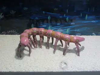 Restitution paléoartistique d'un lobopodien filtreur, Ovatiovermis cribratus, montrant son utilisation de ses 6 paires de lobopodes antérieurs pour capter des particules nutritives, et des 3 postérieures pour s'accrocher[35].