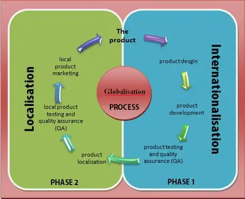 Comme l’expliquait l’Association pour les standards des métiers de la localisation (LISA, Localisation Industry Standards Association), aujourd'hui dissoute, la mondialisation « doit se penser plus en termes de cycle qu’en termes de processus ». [2] Mondialiser consiste à penser à l’avance le design et les méthodes de développement d’un produit, en intégrant les impératifs d’une audience multiculturelle, afin d’éviter des coûts supplémentaires et des problèmes de qualité, de gagner du temps et de simplifier l’effort de localisation pour chaque région et pays. La localisation est donc une composante à part entière du processus de mondialisation dont les deux phases sont :