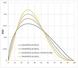 La loi bêta PERT attribue une très faible probabilité aux valeurs extrêmes, en particulier à l'extremum le plus éloigné du mode si la distribution est fortement asymétrique[6],[7]. La loi bêta PERT modifiée [8] a été proposée pour fournir plus de contrôle sur la probabilité attribuée aux valeurs de queue de la distribution. La loi bêta PERT modifiée introduit un quatrième paramètre qui contrôle le poids du mode dans la détermination de la moyenne :