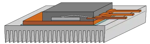 Les éléments de puissance (diodes, transistors, thyristors) sont généralement montés sur des dissipateur thermiques, qui favorisent l'évacuation des pertes produites. Il est généralement prévu un isolant (feuille de mica, de matériau composite, etc.) de façon à isoler électriquement le semiconducteur du dissipateur. Dans ce cas, la résistance thermique jonction-ambiance est la somme de trois termes :