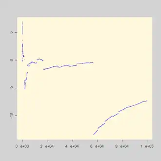 Elle nous montre ainsi que la condition de l'espérance définie selon l'intégrale de Lebesgue est indispensable à l'application de la loi. On remarque que les valeurs moyennes s'approchent de mais il arrive toujours un moment où une valeur trop éloignée « empêche » la moyenne de converger. La probabilité d'obtenir des valeurs éloignées de est en fait trop élevée pour permettre à la moyenne empirique de converger.