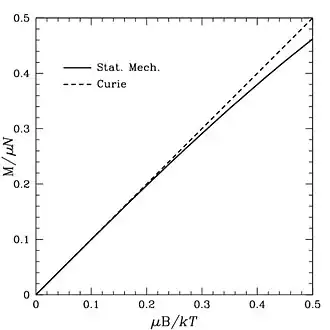Cette loi peut être démontrée par la physique statistique en considérant un système composé d'un grand nombre de moments magnétiques indépendants pouvant s'orienter parallèlement ou antiparallèlement à un champ magnétique appliqué . On retrouve alors la loi de Curie dans la limite où l'énergie magnétique des particules reste très inférieure à l'énergie d'agitation thermique , où est la constante de Boltzmann.