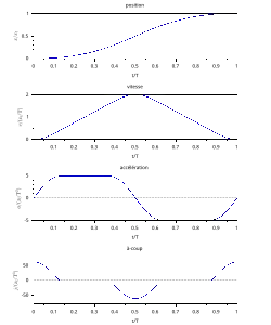 Les conditions initiales et finales imposent six conditions : x(0) = 0, v(0) = 0, a(0) = 0, x(T) = xf, v(T) = 0, a(T) = 0. La fonction x(T) est donc au minimum d'un polynôme de degré cinq :