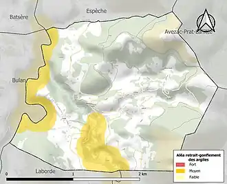 Le retrait-gonflement des sols argileux est susceptible d'engendrer des dommages importants aux bâtiments en cas d’alternance de périodes de sécheresse et de pluie. 14 % de la superficie communale est en aléa moyen ou fort (44,5 % au niveau départemental et 48,5 % au niveau national). Sur les 42 bâtiments dénombrés sur la commune en 2019, 5 sont en aléa moyen ou fort, soit 12 %, à comparer aux 75 % au niveau départemental et 54 % au niveau national. Une cartographie de l'exposition du territoire national au retrait gonflement des sols argileux est disponible sur le site du BRGM[32],[Carte 3].