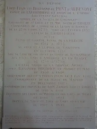 - ↑ Jean-Edmond Weelen, « Une Journée d'Amitié franco-américaine: le centenaire de Lauberdière », dans Un Combattant angevin de la Guerre d'Amérique. Lauberdière. Sa vie, son centenaire (1759-1837), Saumur, P. Richou et Fils, 1948, p. 23.