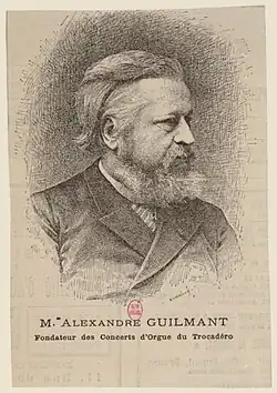Ces concerts classiques programmés[11] au grand orgue avec orchestre (Édouard Colonne) à l'auditorium du Palais du Trocadéro du maître organiste Alexandre Guilmant, étaient fort en vogue, attirant toujours une vive attention de la presse et du public ; aussi trouvons-nous à propos du grand concert du 29 avril 1883 :