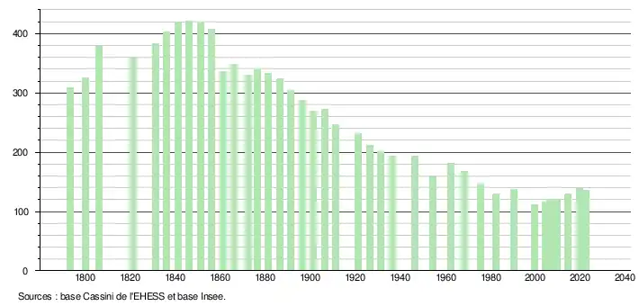 L'évolution du nombre d'habitants est connue à travers les recensements de la population effectués dans la commune depuis 1793. Pour les communes de moins de 10 000 habitants, une enquête de recensement portant sur toute la population est réalisée tous les cinq ans, les populations de référence des années intermédiaires étant quant à elles estimées par interpolation ou extrapolation[43]. Pour la commune, le premier recensement exhaustif entrant dans le cadre du nouveau dispositif a été réalisé en 2004[44].