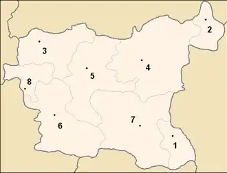 Les noms de localités en caractères gras ont le statut de ville (en bulgare : град, translittéré en grad). Les autres localités ont le statut de village (en bulgare : село translittéré en selo).